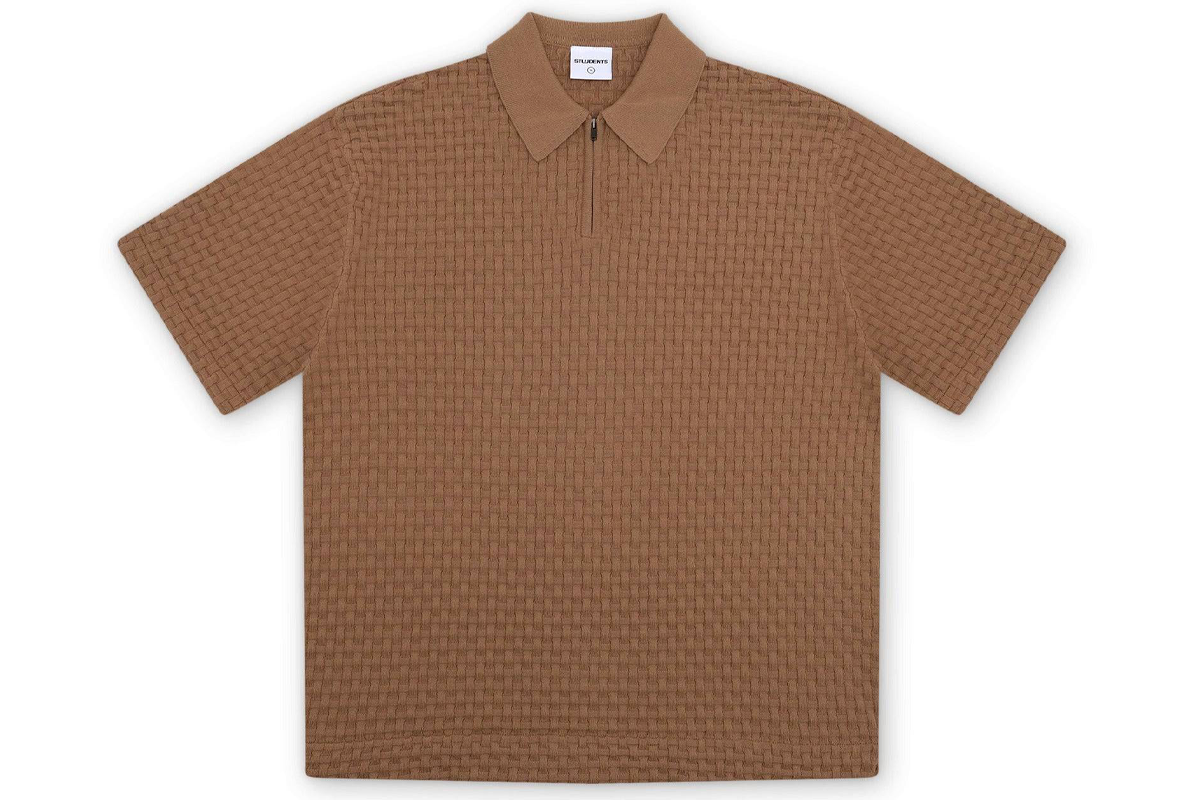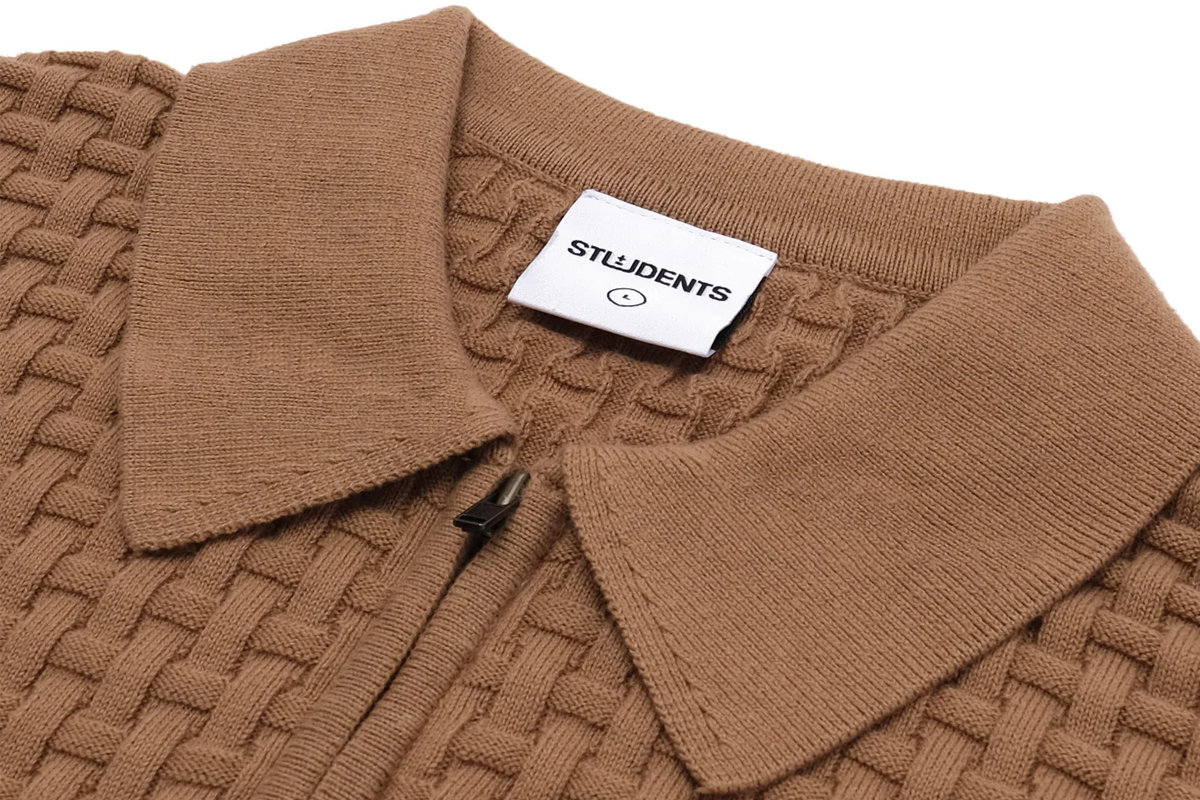 100% cotton tight weave short sleeves cardigan in interlock grid-like pattern, YKK metal zipper front closure, triangle angular side hem, finished with signature "Students" clear poly label.
