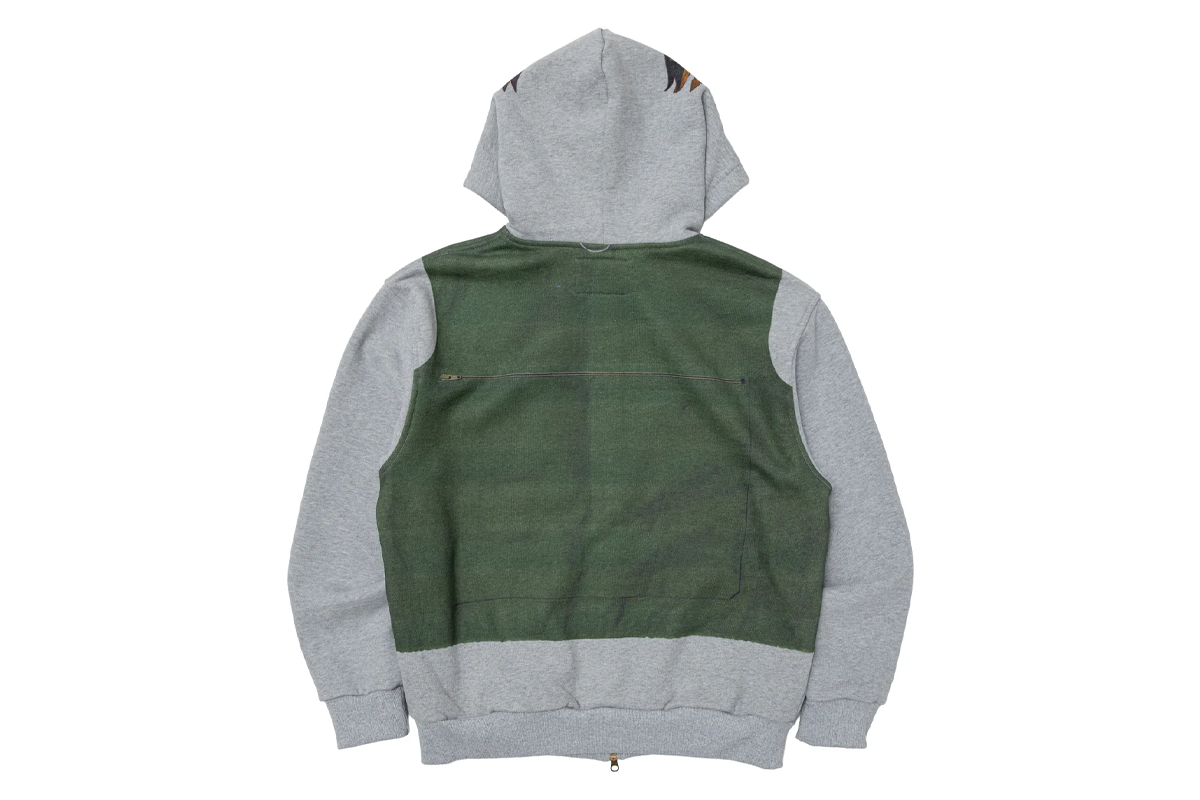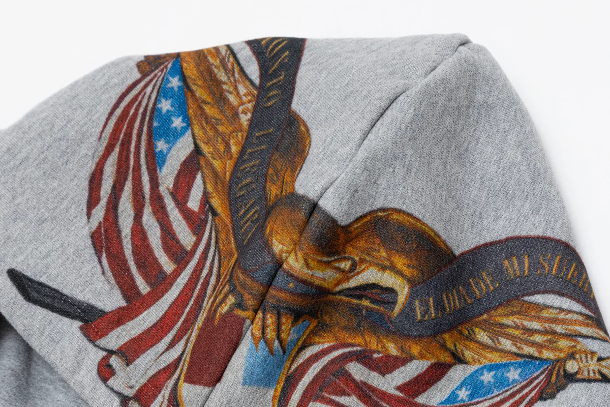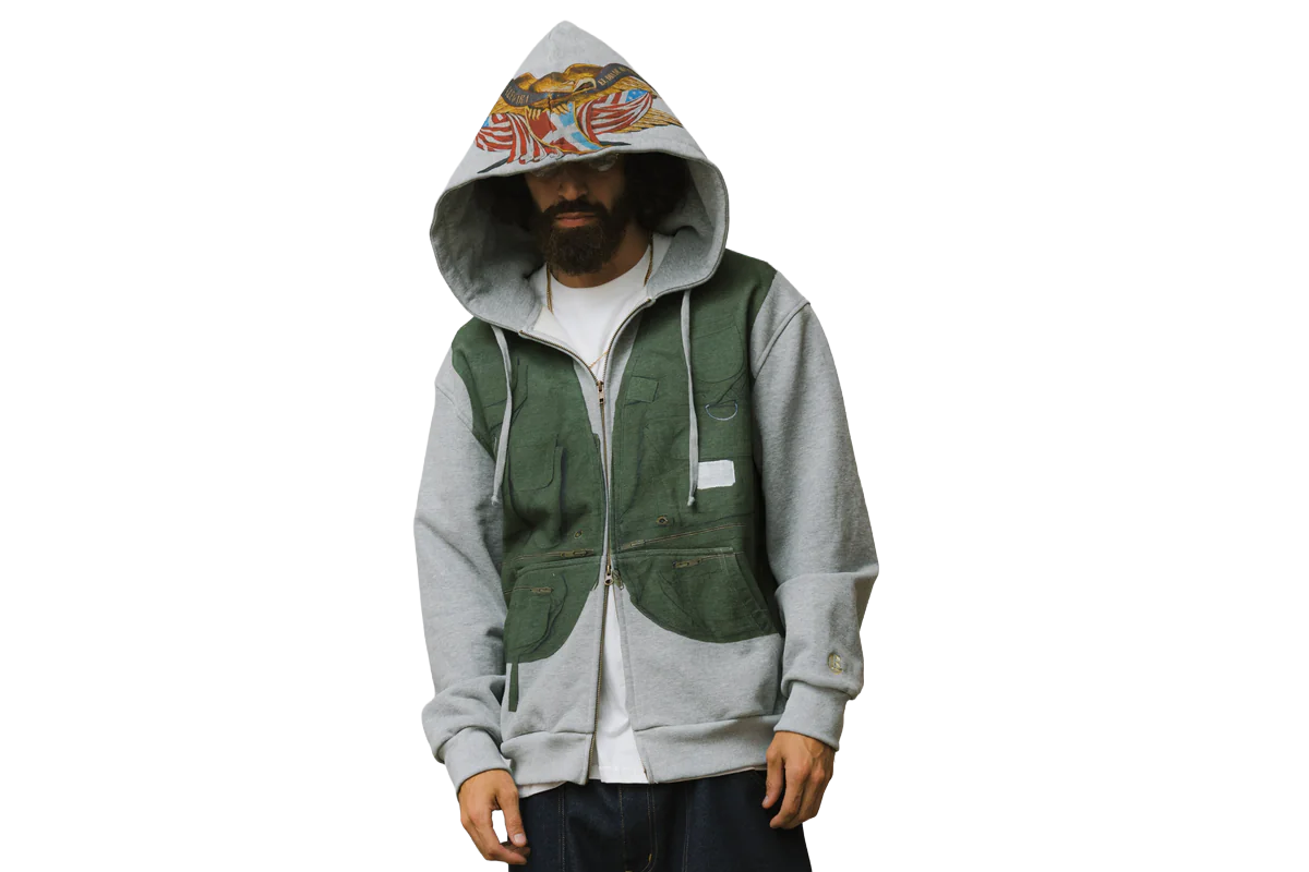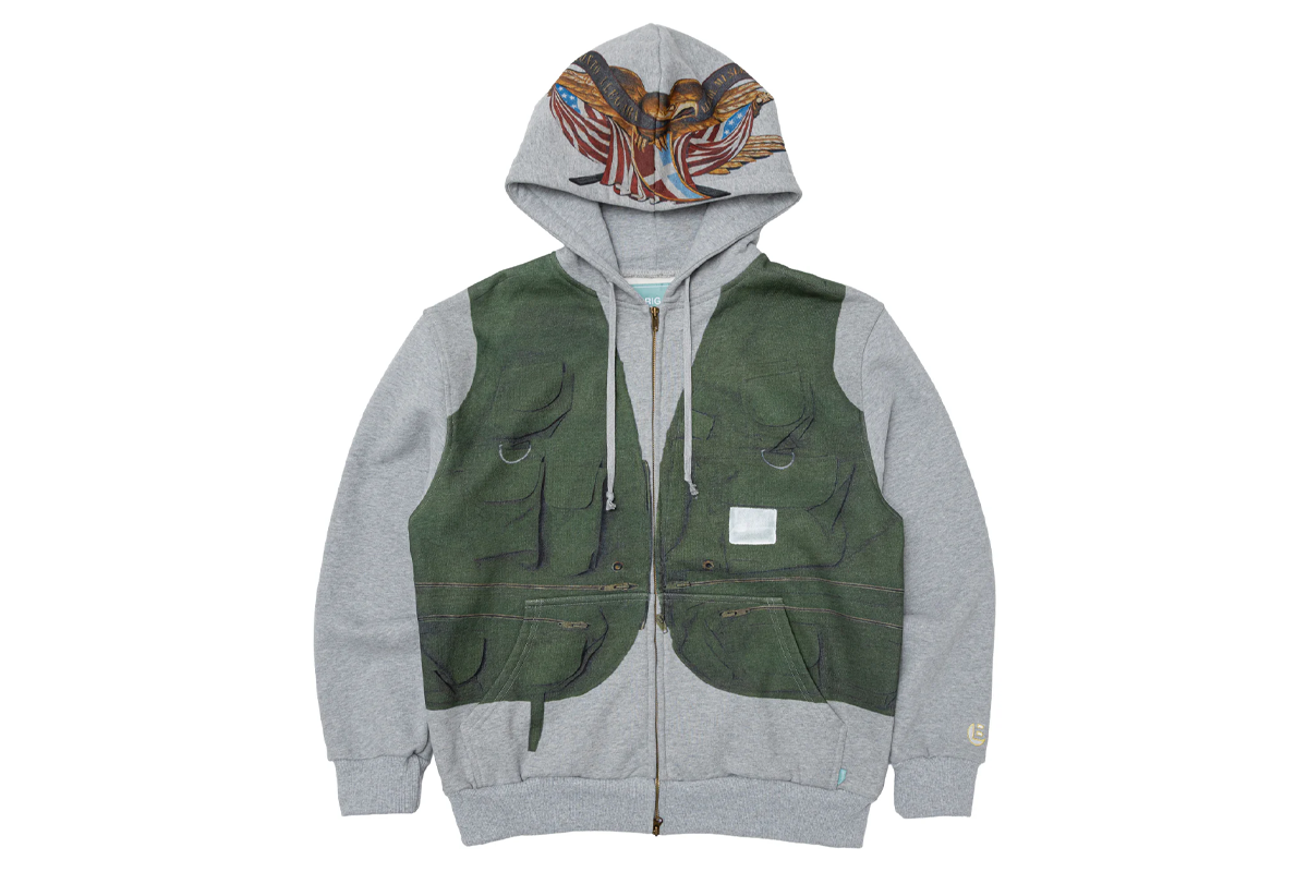 450 GSM cotton fleece hoodie with antique brass double zip. An authentic vintage fisherman's vest is digitally printed over the torso in fine detail. "El Dia De Mi Suerte" artwork is printed over the hood featuring the Lares flag alongside the American flag in Lares colors. Embroidered B Logo on the wrist.